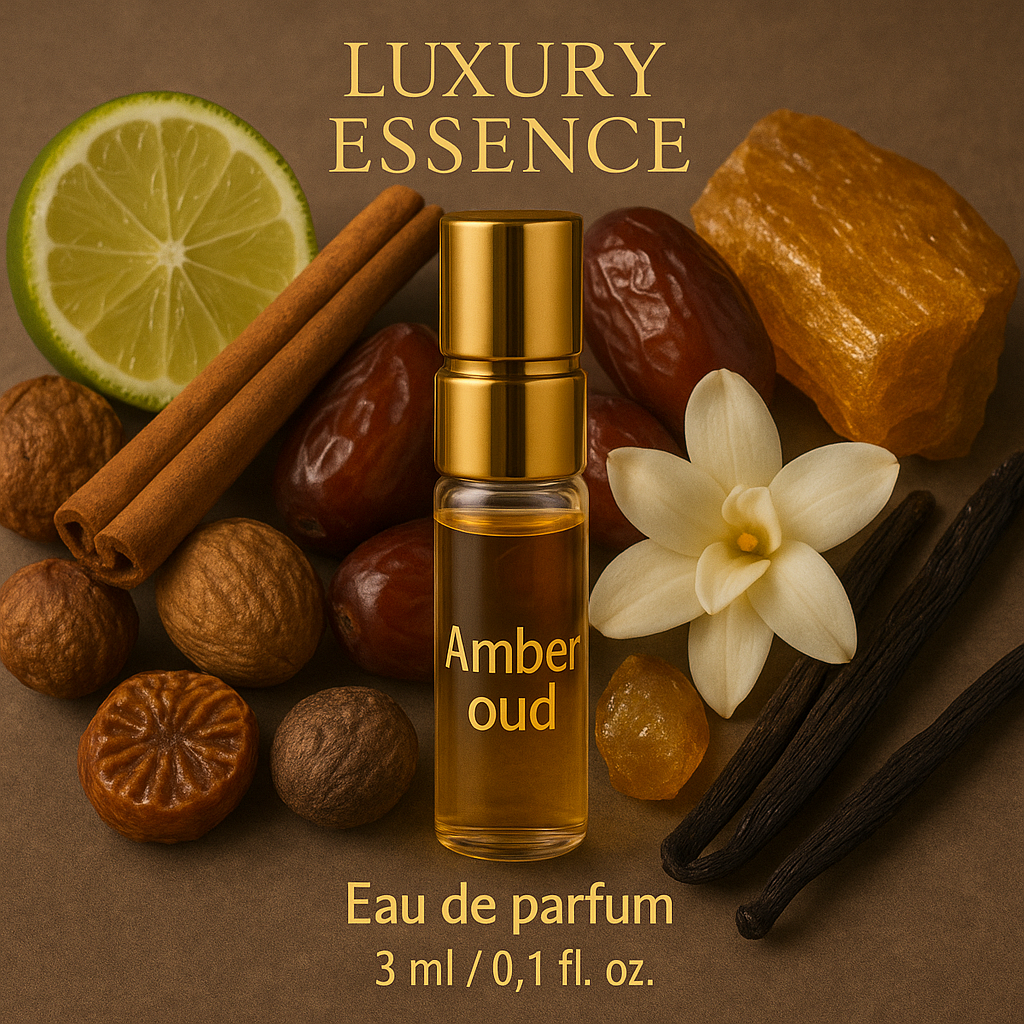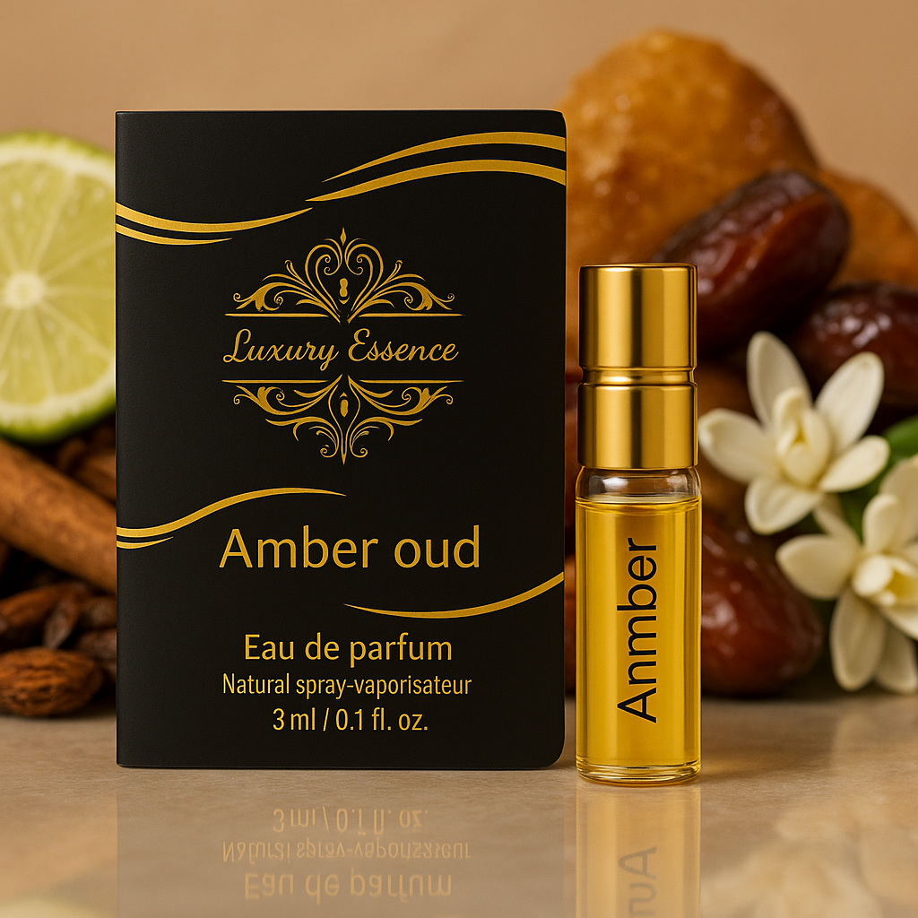 Experience the allure of the Orient with Amber Oud, a 3ml luxury essence sample crafted for those who seek depth, richness, and refinement in every drop.